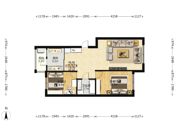 房屋戶型: 2 室2廳 1 廚1衛(wèi)